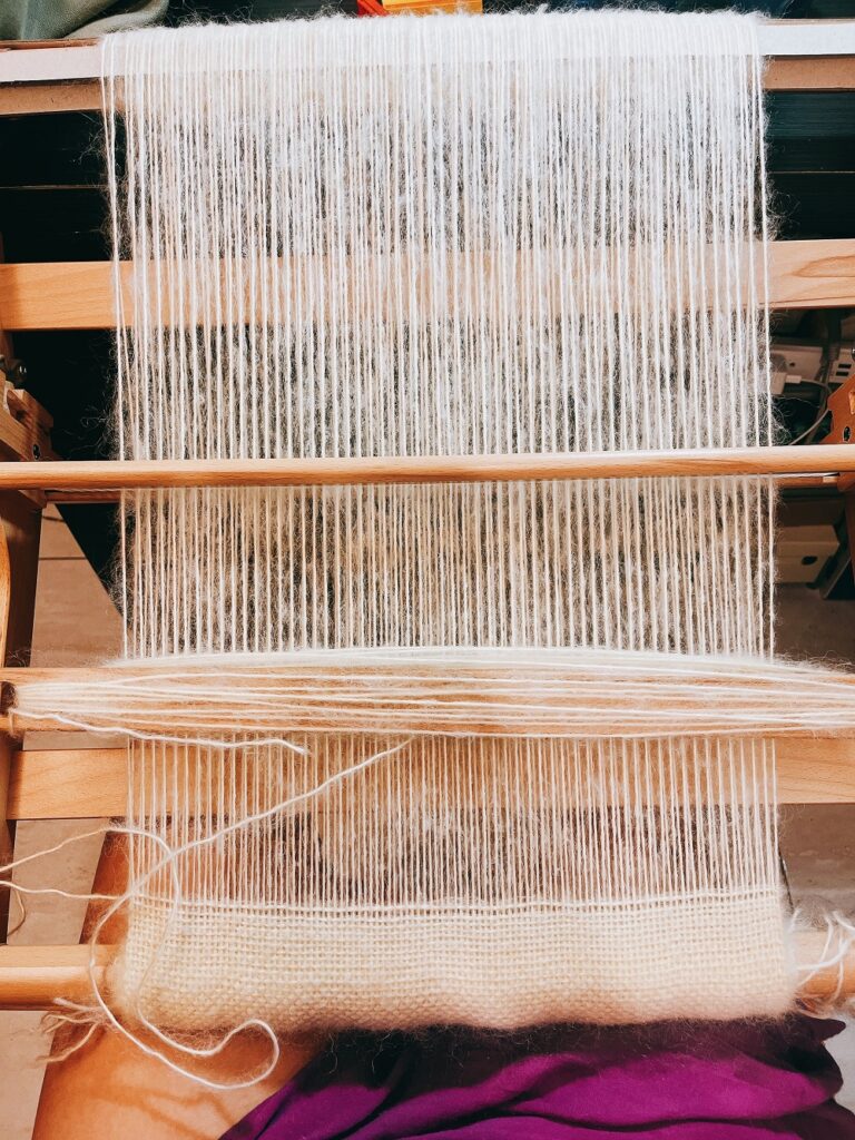 初始著迷於毛海毛線,很喜歡它柔軟的觸感,第一次買毛線就下手英國的羊毛毛海毛線,製作時發現,原來應該要使用間隔更疏一點的塑膠扣(reeds),若塑膠扣的間隔與毛線線經剛好,後續扣合緯線時,經線上的毛海會黏在一起無法動彈。