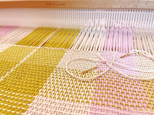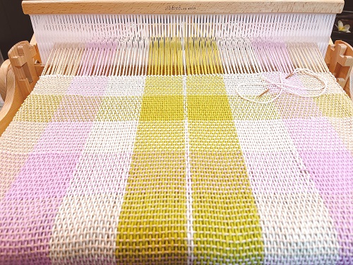 這次稍微搭配過經緯線的顏色,若經緯線都是同樣線徑的棉線,手感會較硬,下次可試將緯線改成細的純棉線,手感會更好。